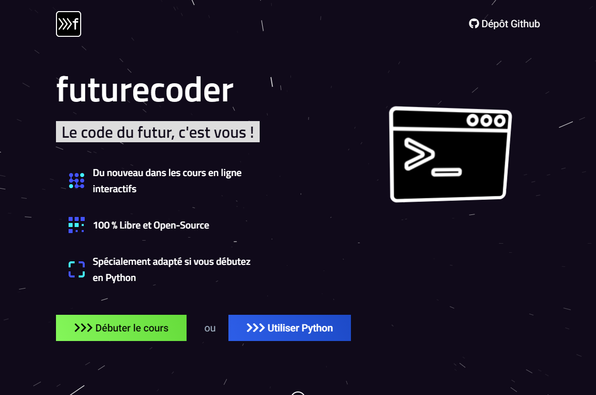 Futurecoder est très pédagogique, organisé sous forme de leçons ponctuées d'exercices de programmation. Les concepts importants sont introduits progressivement et il n'y a rien à installer car tout se passe dans le navigateur.