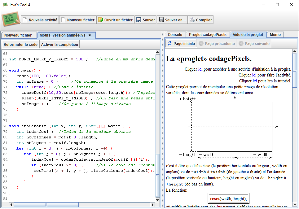 L'INRIA (Institut national de recherche en informatique et en automatique) a développé il y a quelques année une application pour aider à débuter dans le langage Java : Javascool (pour "Java's cool"). Elle permet de masquer certaines complexités du langage qui pourraient rebuter les débutants tout en proposant des modules ("activités") pour aborder de façon simple différents thèmes comme le graphisme, la communication réseau ou le chiffrement. L'aide fournie dans la fenêtre latérale est très utile (commencer par l'activité "abcdAlgos" qui explique les bases). Un logiciel très pratique pour ceux qui sont débutant et s'essayent à Java.
