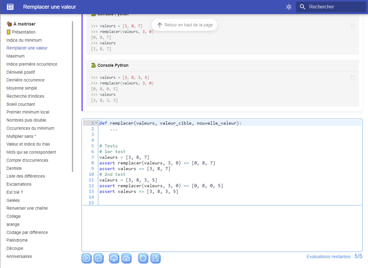 Il permet d'écrire directement son code python et de l'exécuter dans le navigateur. La réponse est ensuite vérifiée et un corrigé est proposé en cas de réussite (pour comparer sa solution à celle proposée par l'auteur(e) du sujet) ou de trop nombreux échecs.